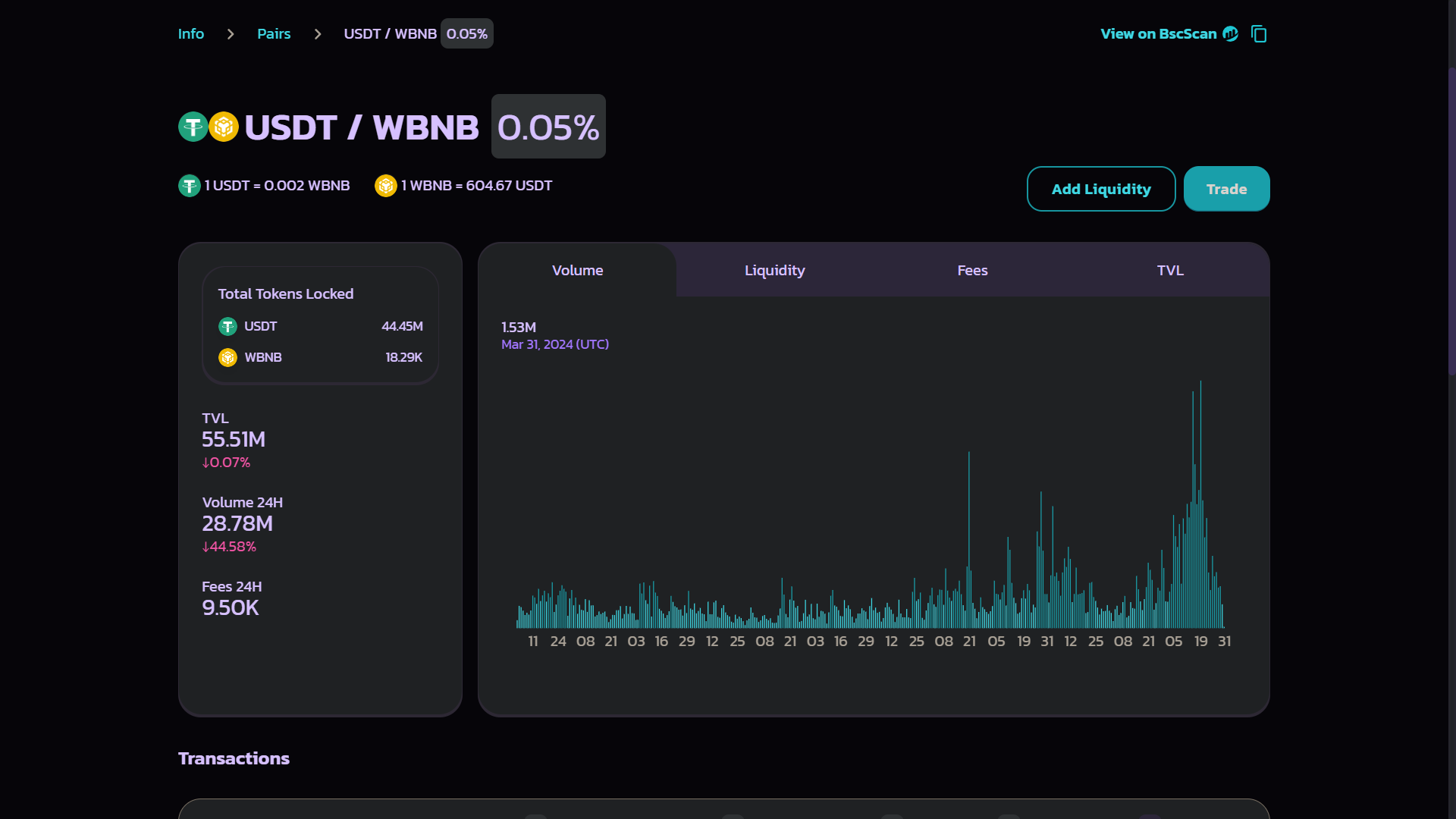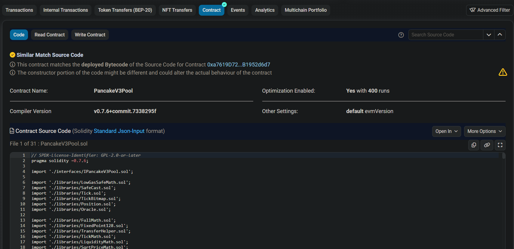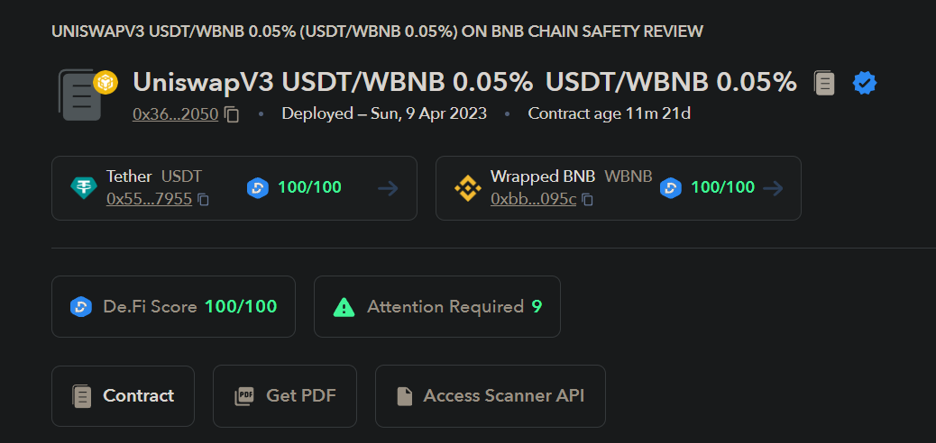 Смарт-контракты пишутся, с использованием языков программирования, по типу Solidity. Для Dapps хорошим тоном является предоставление исходного кода своего смарт-контракта. Это позволяет сторонним пользователям убедиться в его безопасности. Существует множество внешних ресурсов (Etherscan, Bscscan и т.д.) предоставляющих информацию о безопасности смарт-контрактов. Для примера возьмем одну из пар на бирже PancakeSwap. У них на сайте есть ссылка на смарт-контракт данной пары в обозреватели сети.
